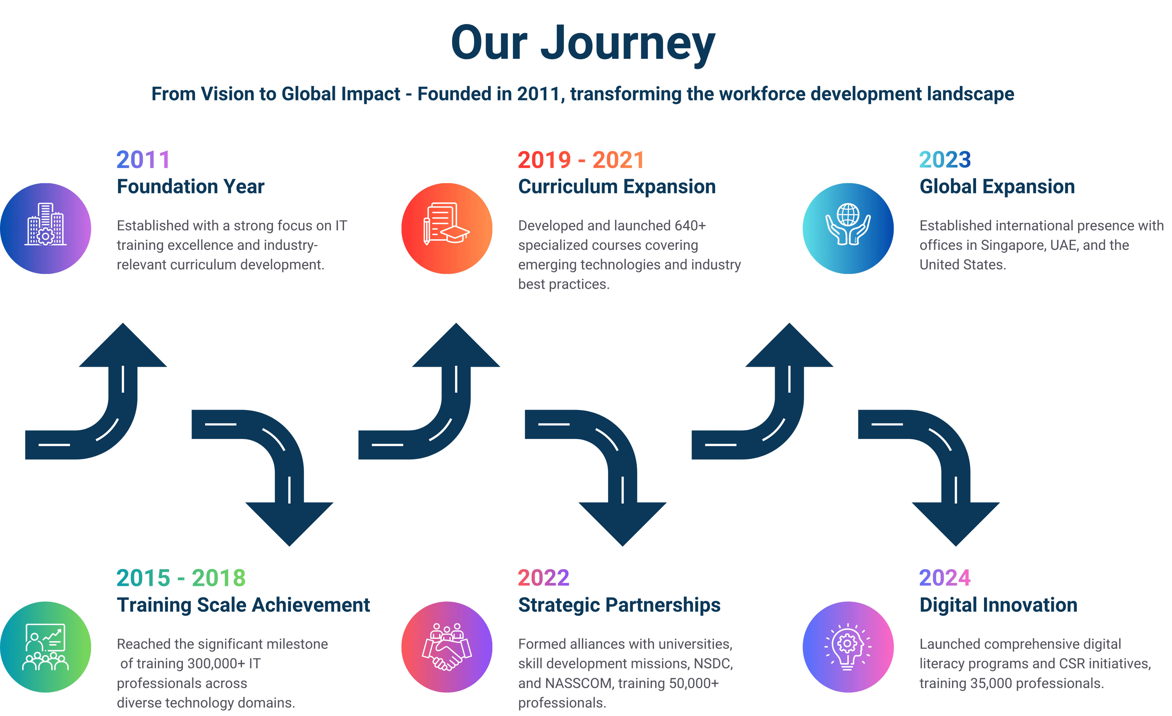 With a proven track record of training over 300,000 learners and successful CSR collaborations with partners like NSDC, NASSCOM, and Microsoft, we are committed to driving scalable, inclusive skilling initiatives across India, the UAE, the US, and Singapore, preparing diverse talent for the AI-powered future.